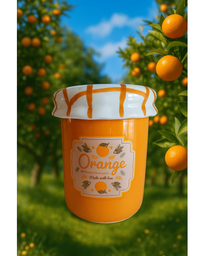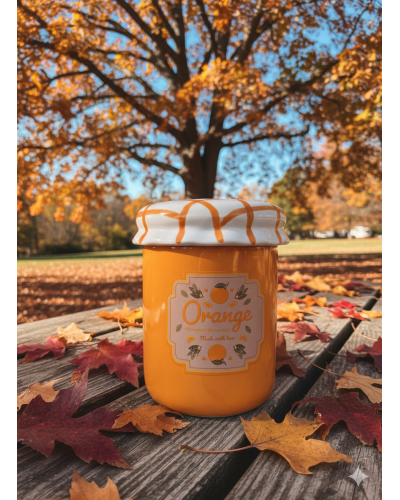 Un quemador único que parece sacado directamente de la despensa más dulce. Su diseño recuerda a un frasco de mermelada de naranja, con detalles llenos de encanto que lo hacen diferente a cualquier otro.
